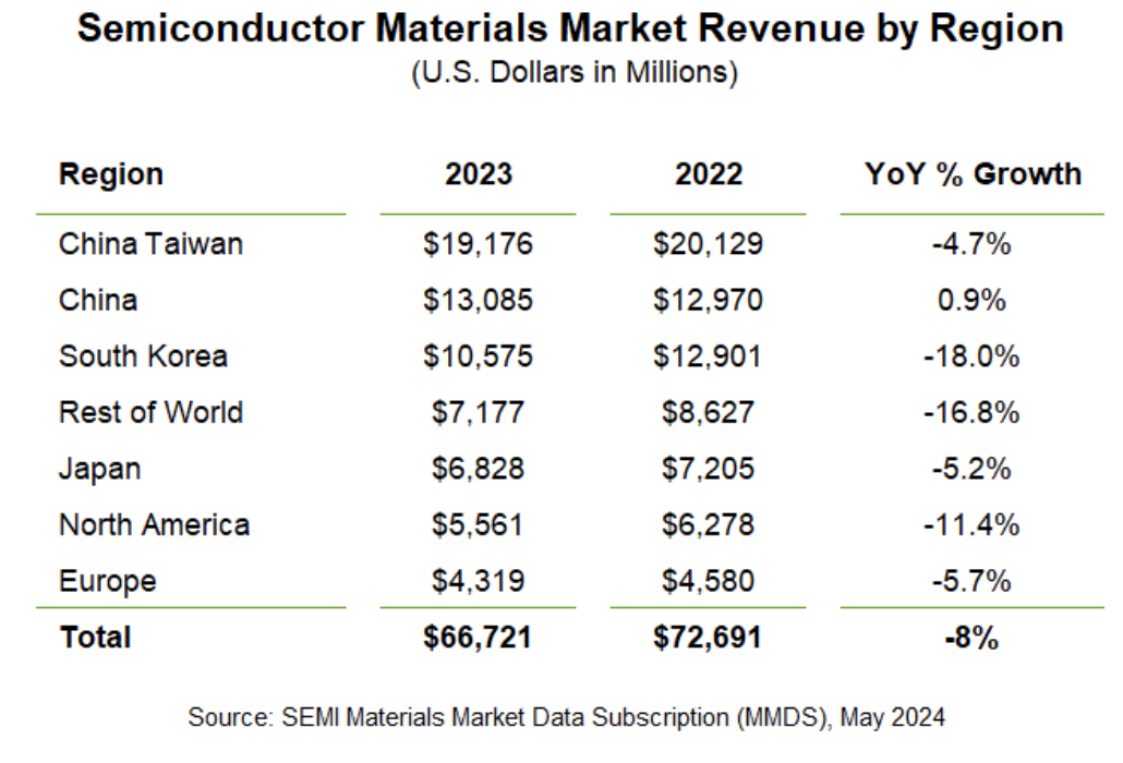 中国台湾以192亿美元的销售额,连续第14年成为全球最大的半导体材料消费地区。中国大陆的销售额为131亿美元,继续实现同比增长,在2023年排名第二。韩国的销售额为106亿美元,仍然是第三大消费地区。2023年,除中国大陆以外的所有地区都出现了个位数或两位数的高跌幅。
